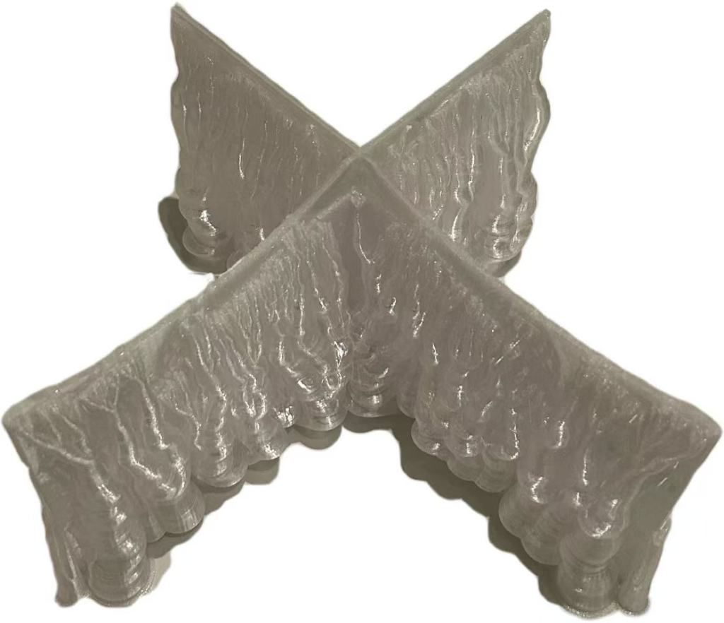 The 3D-printed book stack places the book containing translucent layers of the print. These are before the printing supports are disassembled from the object.