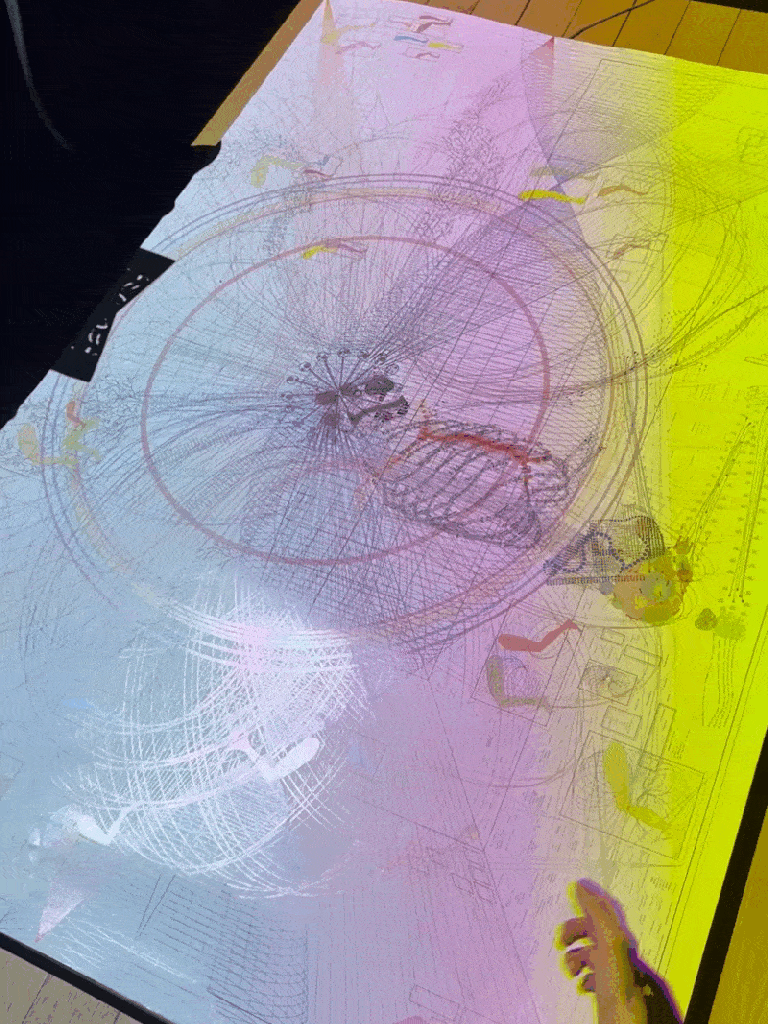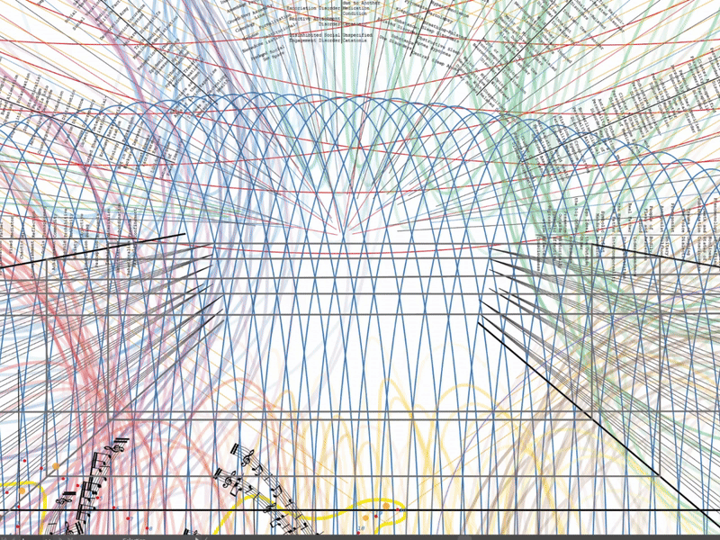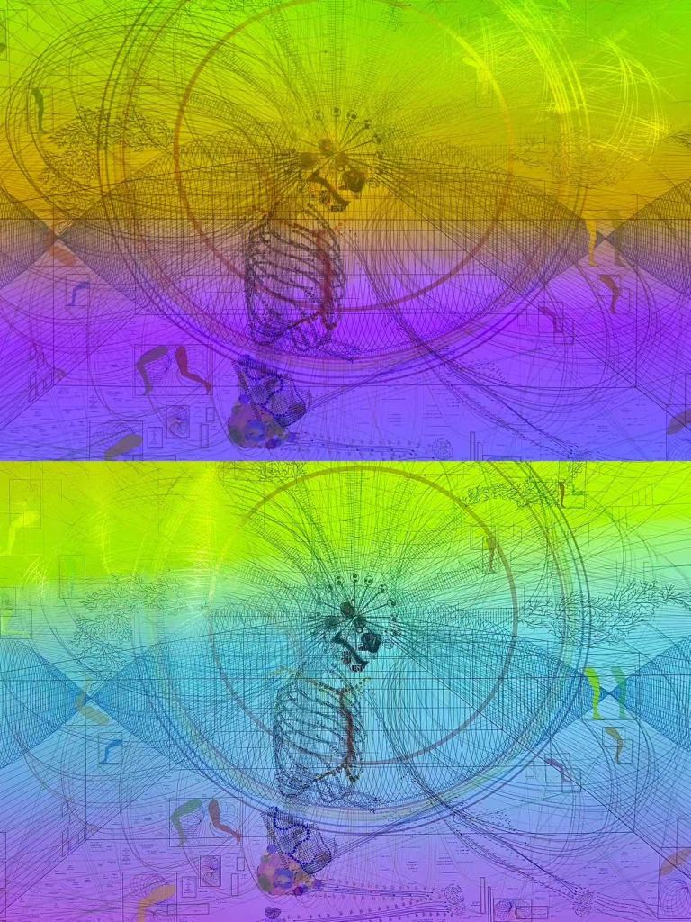 The radiating texts surrounding the skull are a listing of diseases from the Diagnostic and Statistical Manual of Mental Diseases, Fifth Edition with an urge to understand how mental states function like digital bloodstreams through our skeletons, our souls presented in different moods or personalities categorized by the academia, which feels confining, but a platform to express ourselves with the texts adhered to our abstract behaviors and sensations. Therefore, I transform these philo-psychological textual descriptions into music keys, biological diagrams, and connections of numbers dot to dot to form anatomical structures. The skeleton of knowledge and experiences has a radioactive energy visualized in atom radiation pathways in quantum physics, rhizomatic growth of neurons.