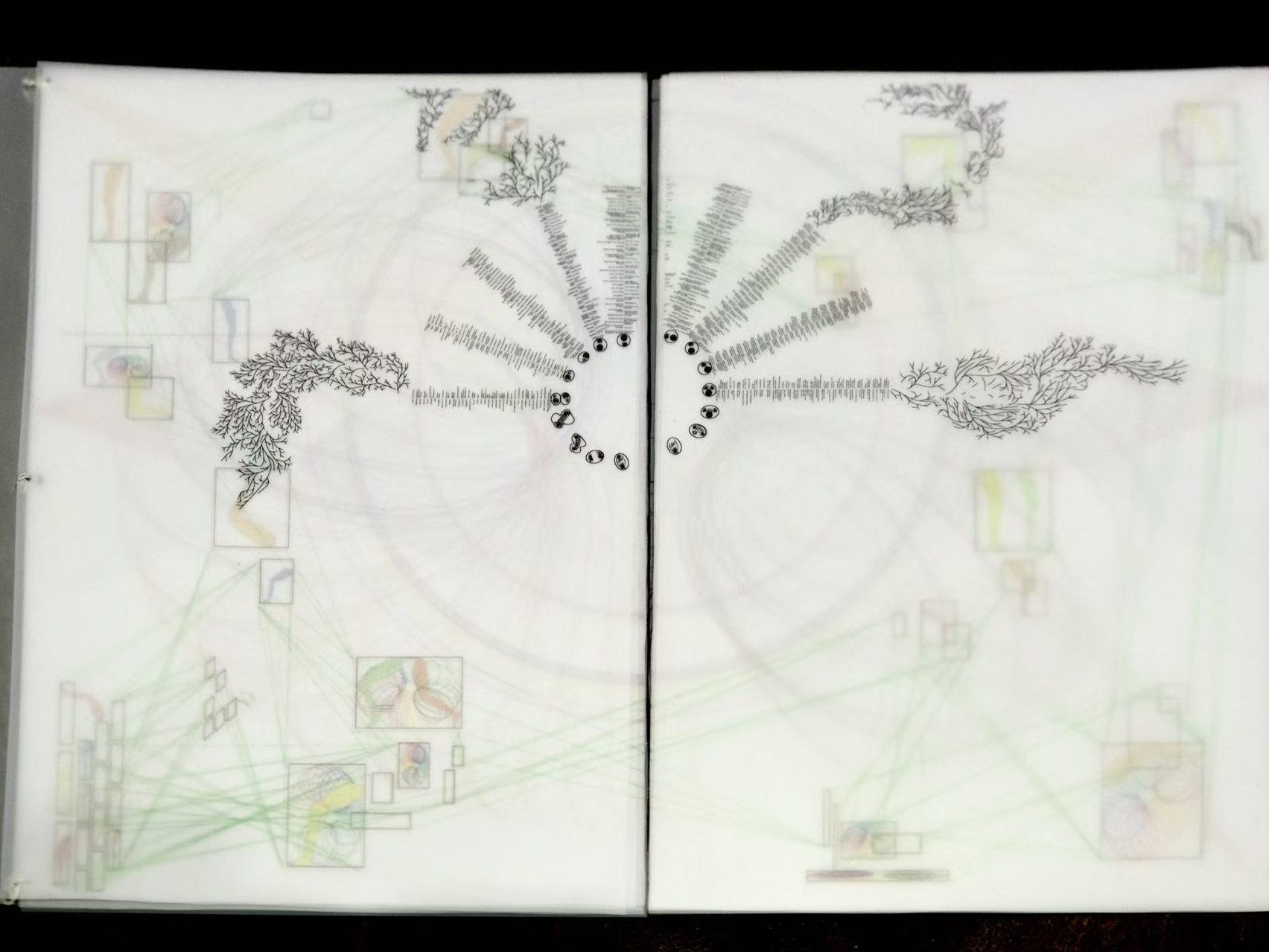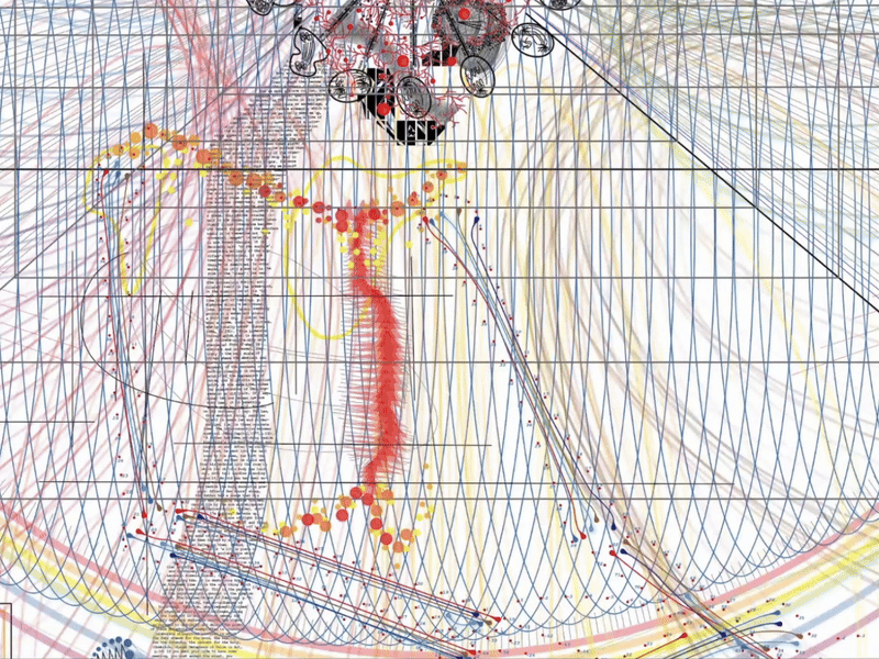 The diagram is also 3D-printed onto a book stack for audiences to browse through layers of the infographics, and a zine with translucent layers so audiences can view each layer of lines separately.