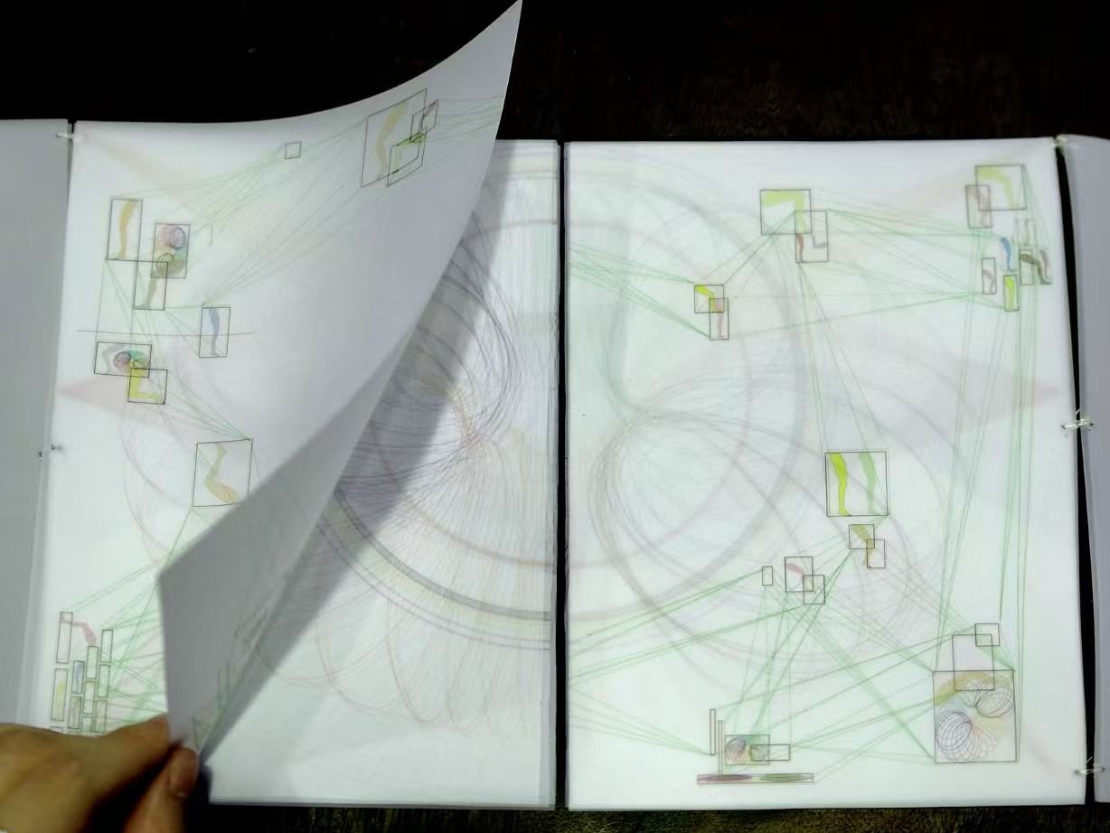 In the final presentation form, As an extension, I print the work in different layers on translucent polyester film paper and pile them up with sewing booking binding methods onto a black plastic board, making the digital image interactive to audiences’ sensation, in addition to the changes in views when they flip through the pages.