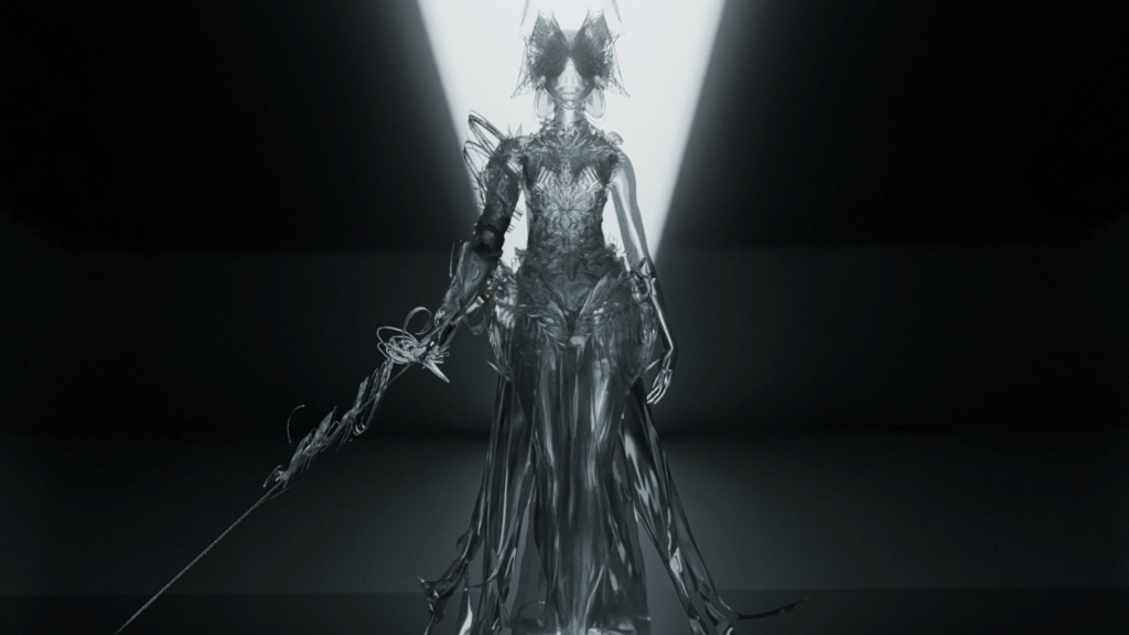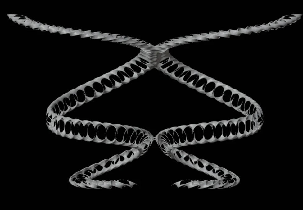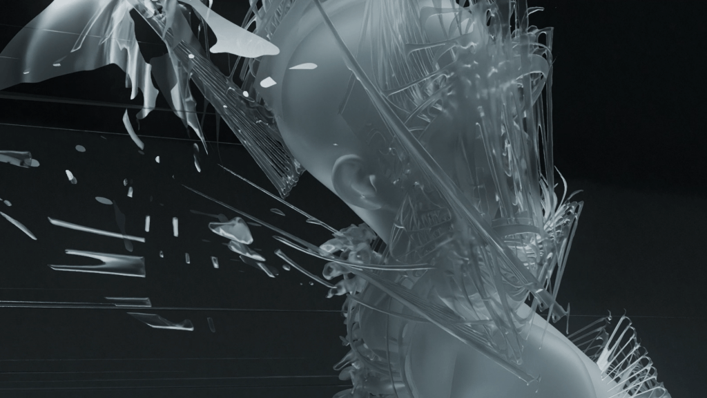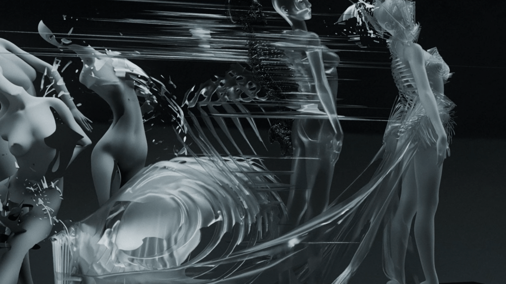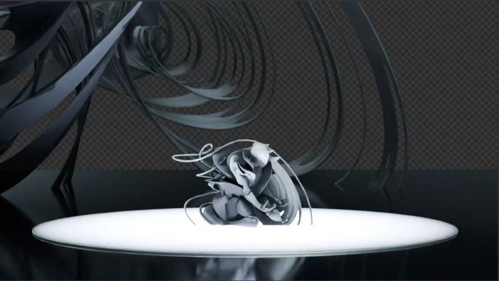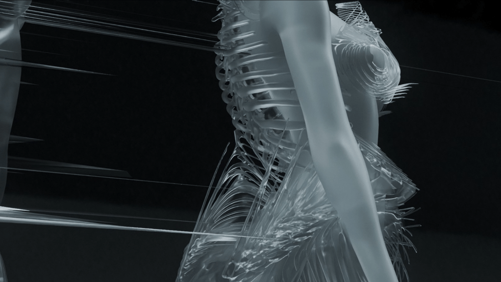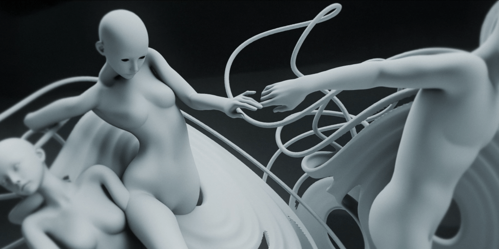 The flow, tantacles, and swirling patterns of the models exaggerates the choreography’s emotions. A synthetic world of artificialliy generated forms that are nonexistent in rea life is portrayed realistically in a studio light setting.